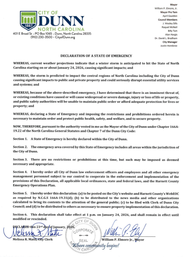 Beginning Sunday, March 1, 2026, the City of Dunn will be temporarily changing the current disinfection process of the potable water from the use of chloramines to free chlorine. The City of Dunn will resume the chloramination process on Wednesday, April 1, 2026.