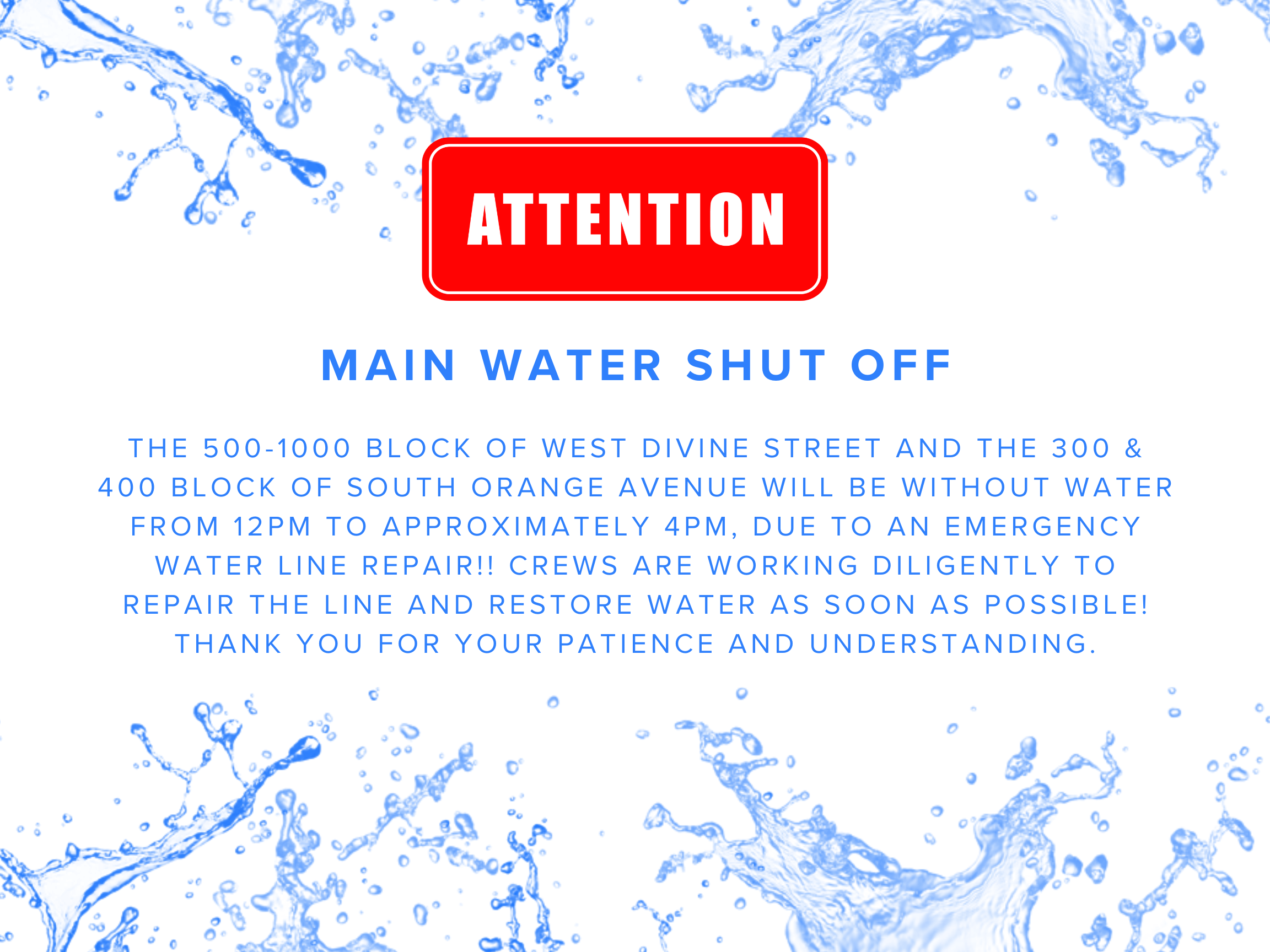 The 500-1000 Block of West Divine Street and the 300 & 400 Block of South Orange Avenue will be without water from 12pm to approximately 4pm, due to an emergency water line repair!! Crews are working diligently to repair the line and restore water as soon as possible! Thank you for your patience and understanding.