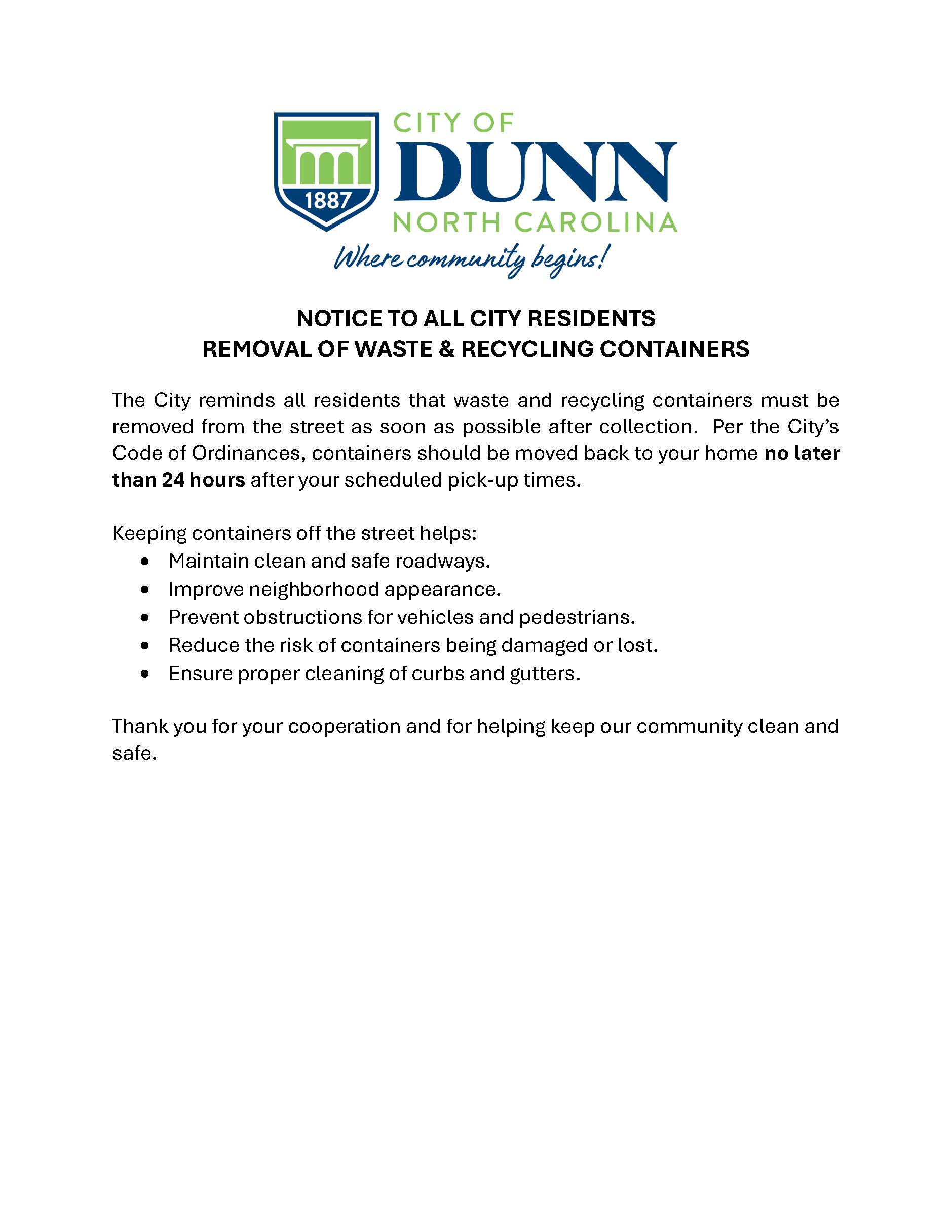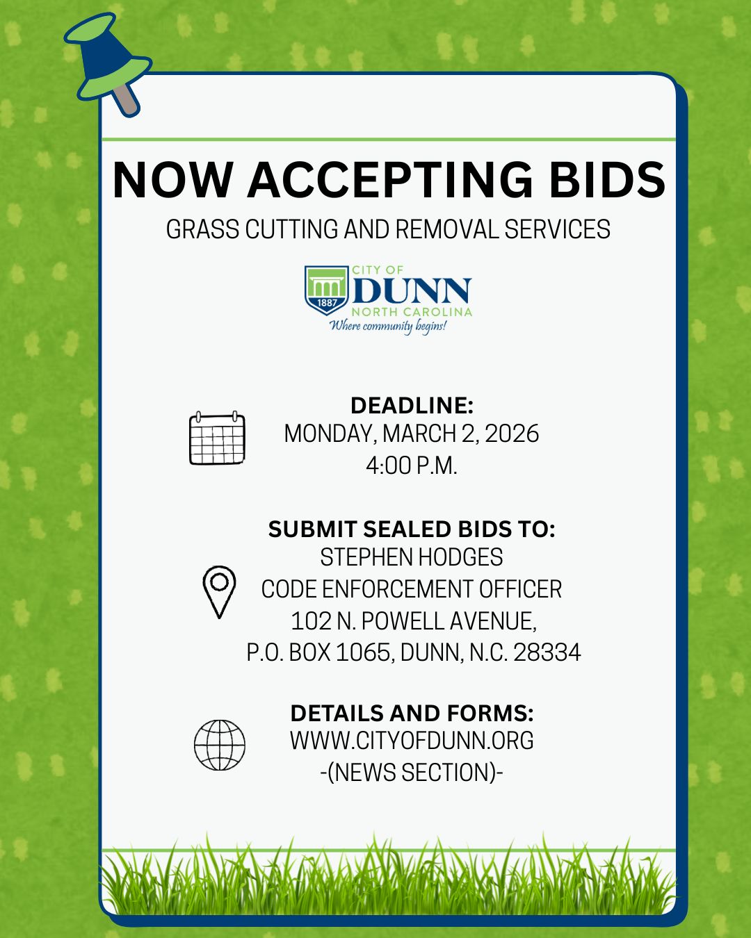 To be considered, all bids must be sealed and received by Stephen Hodges, City of Dunn Code Enforcement Officer at 102 N. Powell Avenue, P.O. Box 1065, Dunn, N.C. 28334, by Monday, March 2, 2026, at 4:00 p.m. at which time all bids will be opened.